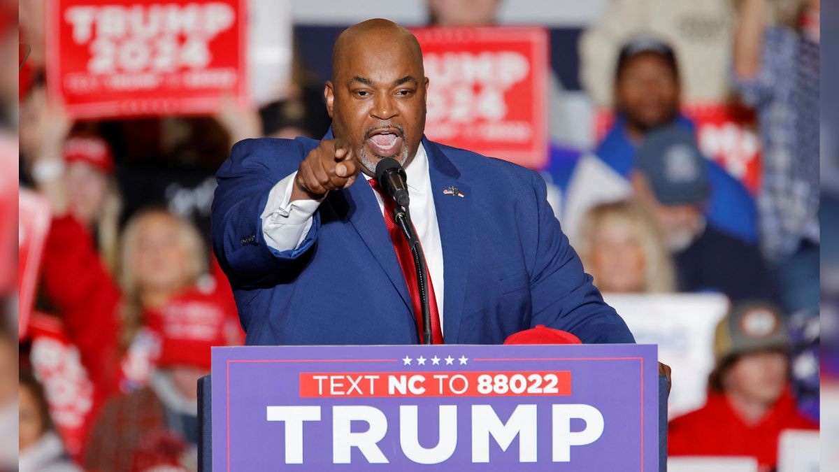 2024年3月2日,共和党北卡罗来纳州州长候选人、现任北卡罗来纳州副州长马克·罗宾逊在美国北卡罗来纳州格林斯博罗举行的集会上发表讲话。文件图像/路透社”、“高度”:675年,“宽度”:1200}}
